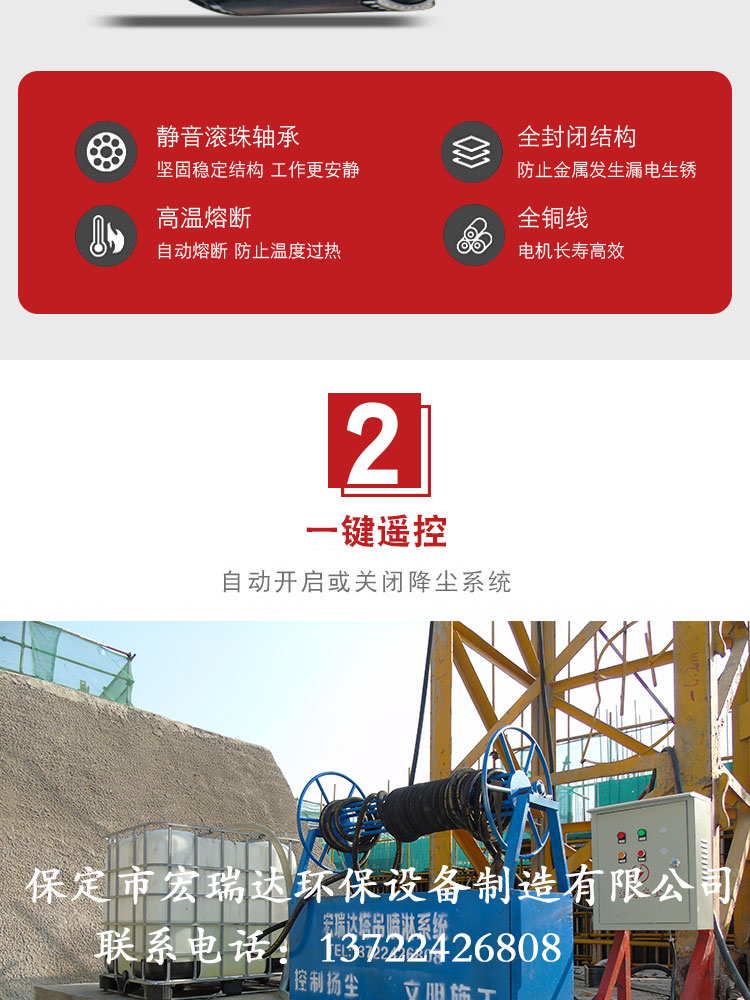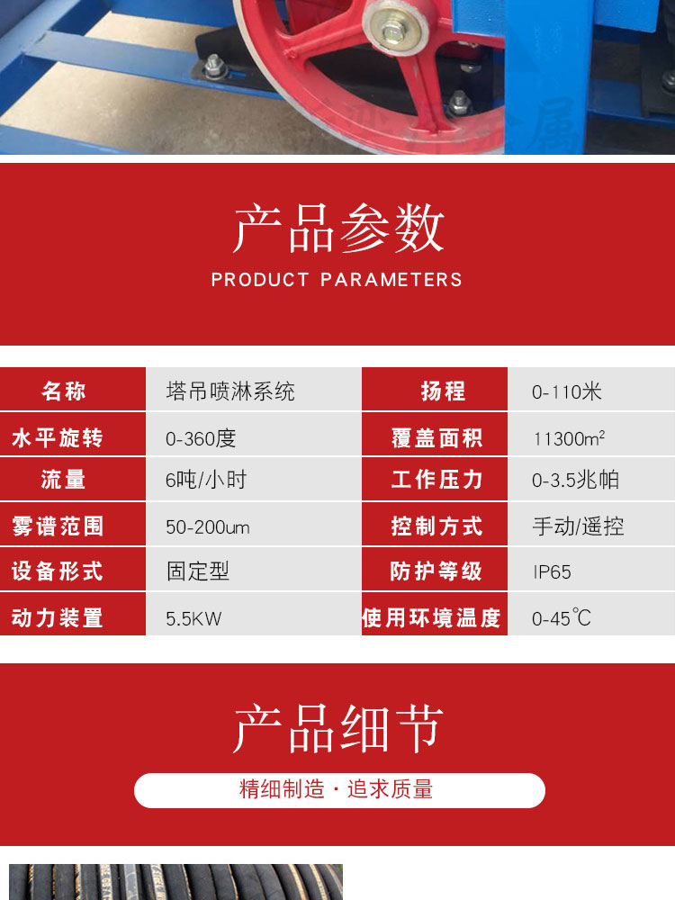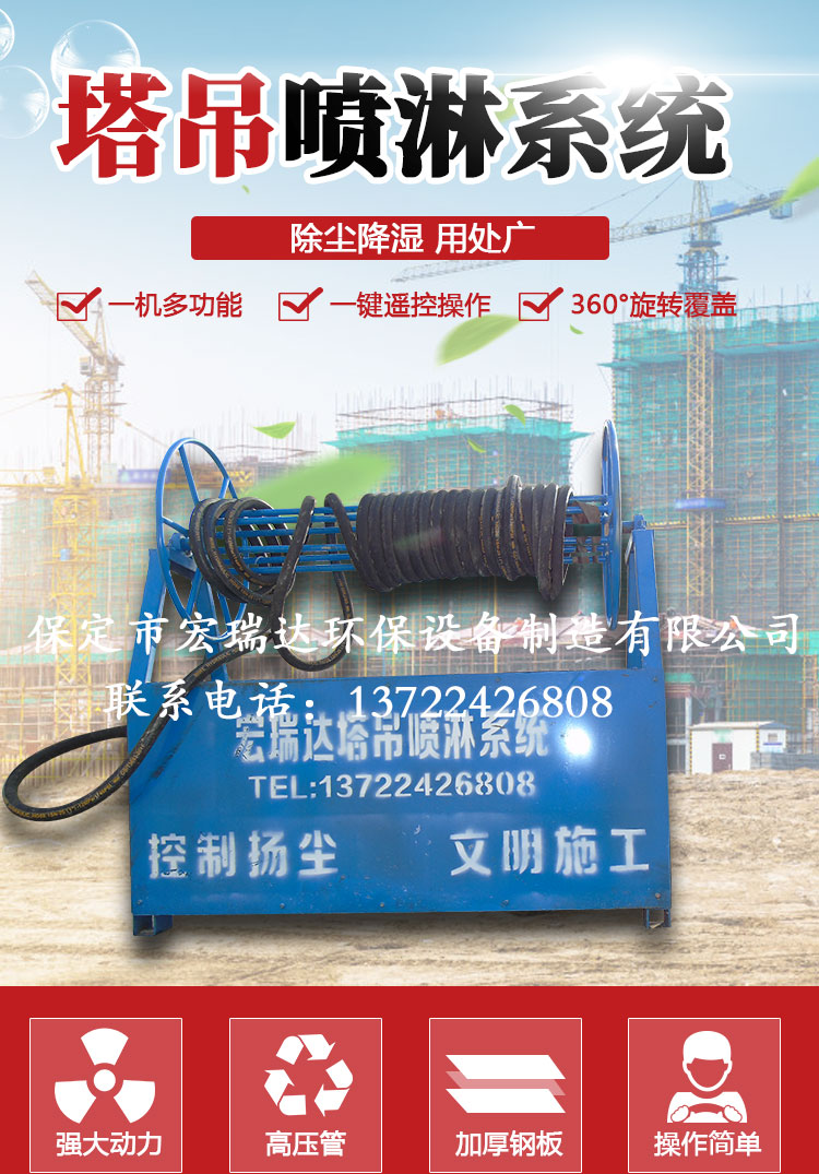 - HRD-60塔吊噴淋系統噴淋范圍廣,可以360度旋轉,能夠有效地控制揚塵,治污減霾,高溫天氣可以降溫,還可以預防并減少火災,可與市政管網連接取水,也可以與重復水回收系統相結合,有手動、自動兩種控制方式。