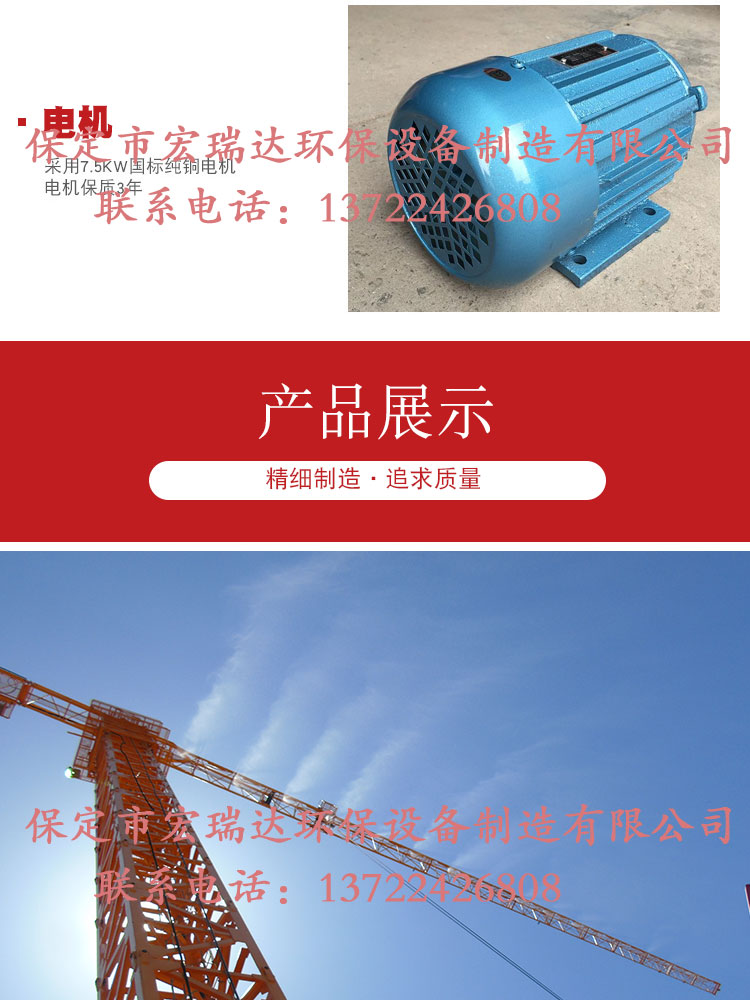 - HRD-120塔吊噴淋系統噴淋范圍廣,可以360度旋轉,能夠有效地控制揚塵,治污減霾,高溫天氣可以降溫,還可以預防并減少火災,可與市政管網連接取水,也可以與重復水回收系統相結合,有手動、自動兩種控制方式。